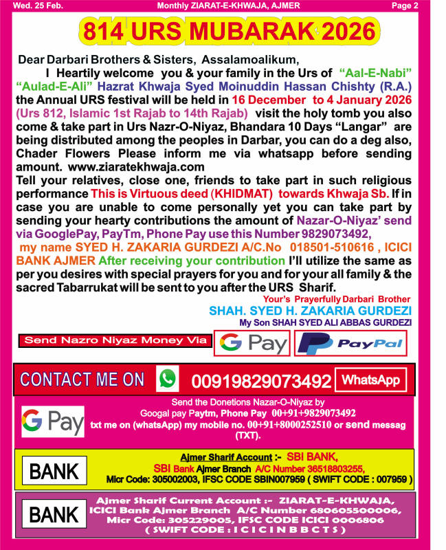 HEAD OFFICE ZIARAT-E-KHWAJA (R) AJMER SHARIF DARGAH Paytm ke liye mobile number 9829073492 AJMER SHARIF DARGAH Paypal:-syedgurdezi@gmail.com Monthly Chatti Sharif 27 January 2025 Annual Urs 814 Chatti Sharif Online Donations for Urs 2025-814 Ajmer Garib Nawaz (R,A) , Online Contributions for Urs 814 Langar. If anyone want to send Money (Nazrana) for Urs Mubaraq 814-2025 Urs deg, Urs Nazrar O Niyaz, Urs Langer, Urs Chatti Sharif, Urs Chader phool, they can send Via Google Pay, Phonepe, Paytm, Via Bank 9829073492 Via Bank
